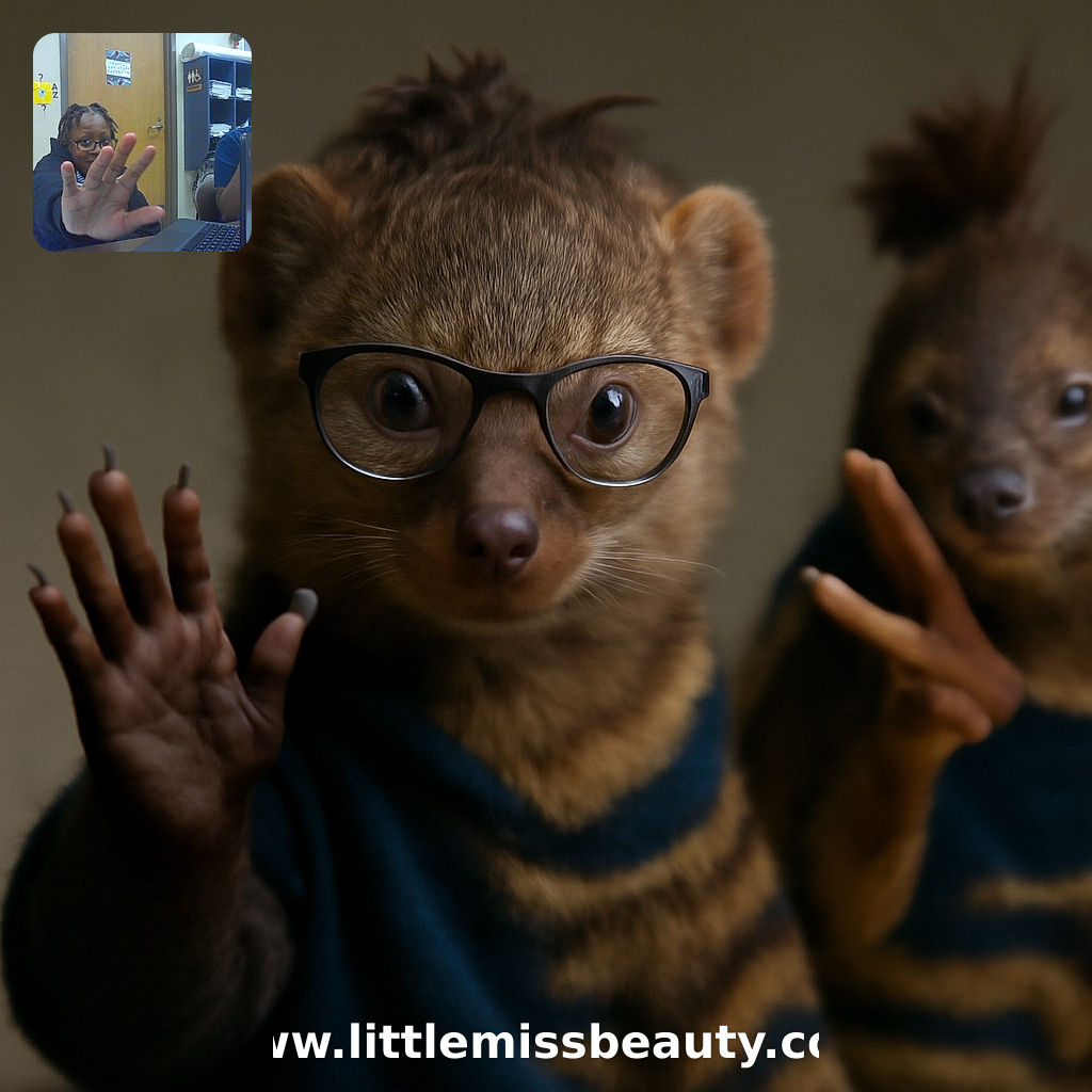 • Two kids hang out in a classroom setting, one playfully blocking the camera with an open hand while the other flashes peace signs behind a laptop, surrounded by shelves, papers, and a red apple adding a pop of color.